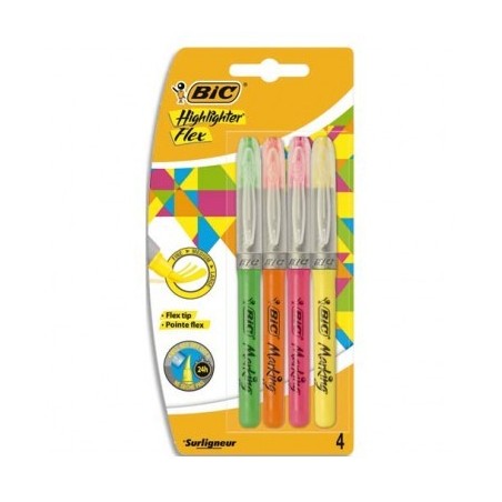 BIC Pochette de 4 surligneur Flex pointe pinceau. Trait 1 à 4,3 mm. Jaune, orange, rose et vert